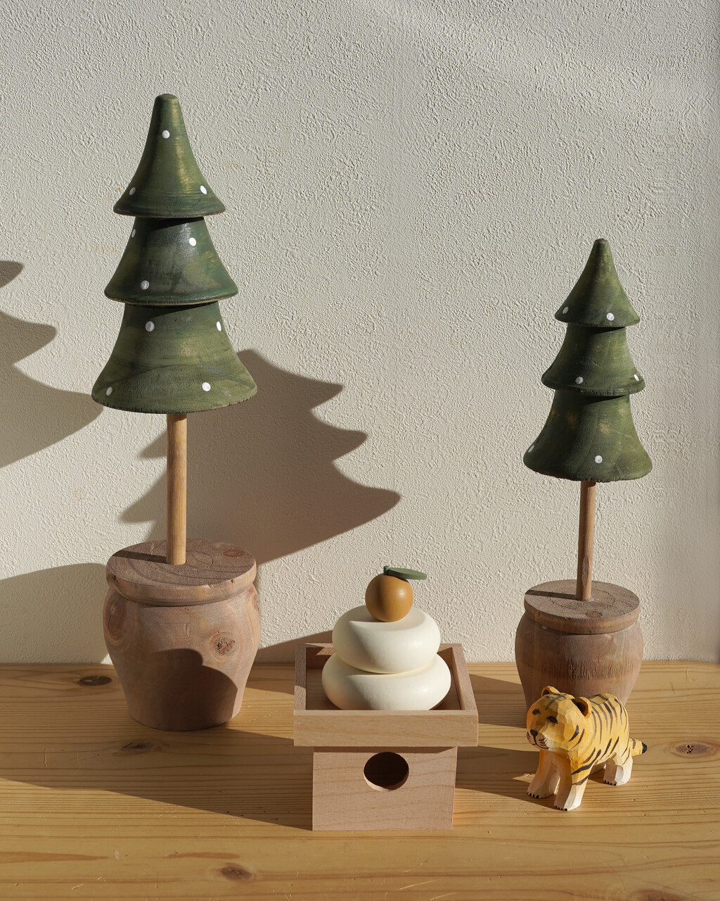 「Salut!」のお正月雑貨を、同じくクリスマスに「Salut!」で購入した木製ツリーと並べてみました♪